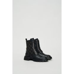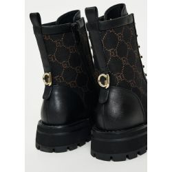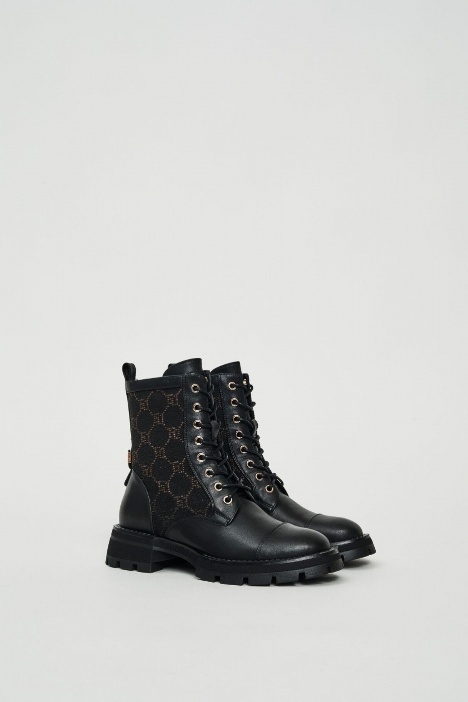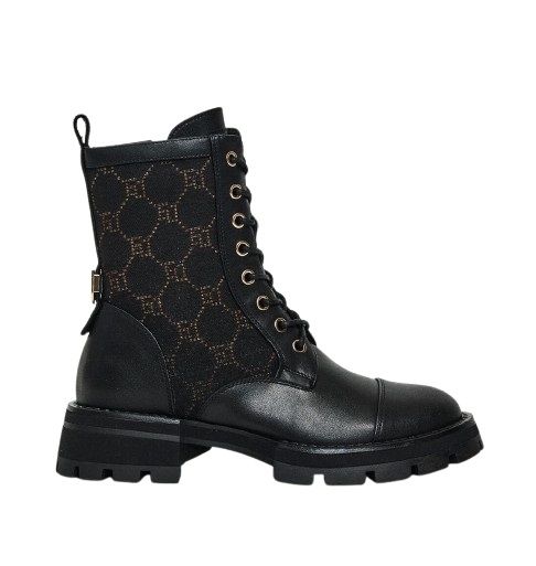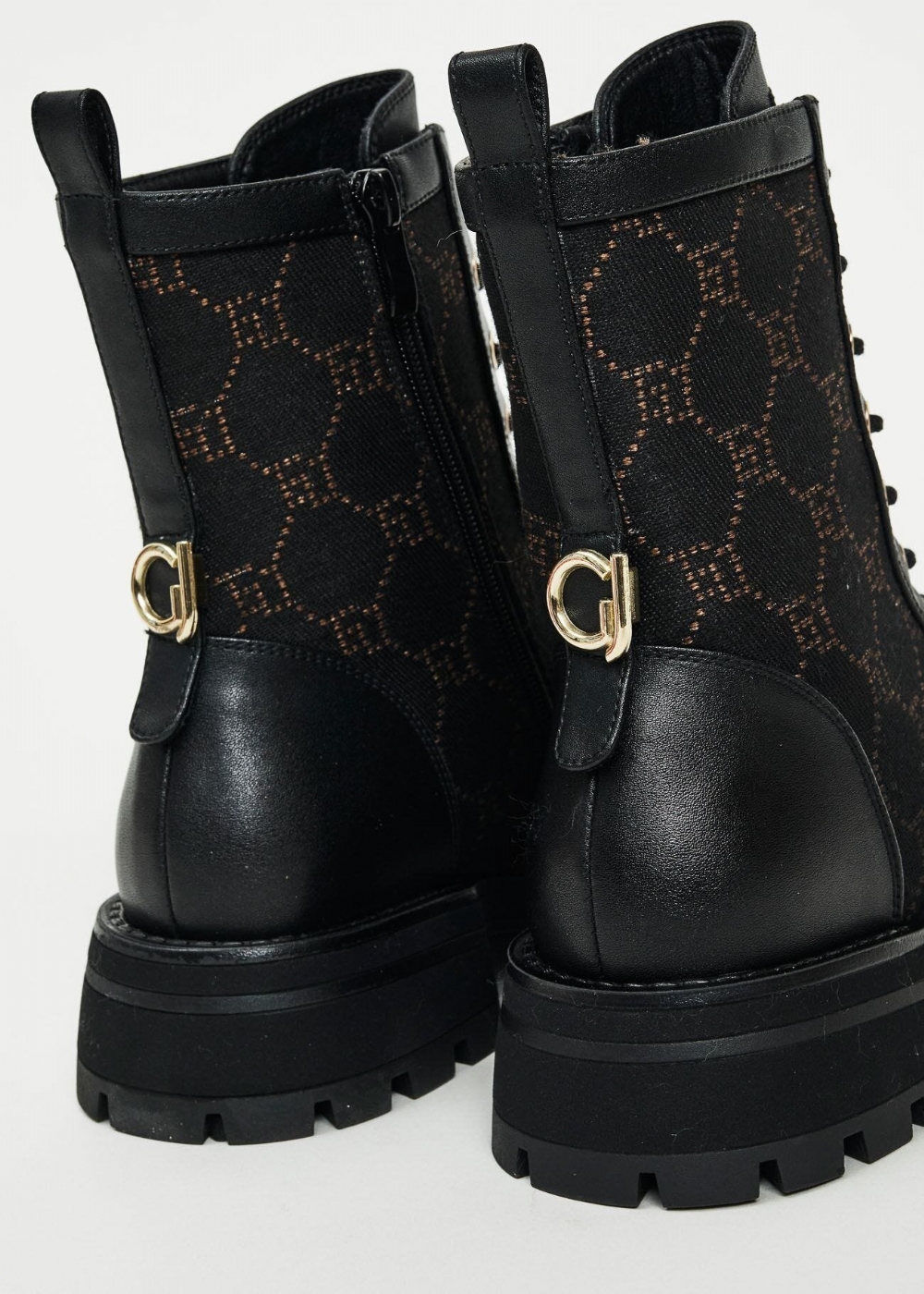 allacciato in pelle e jacquard personalizzato con logo in metallo su linguetta e accessorio personalizzato su cinturino posteriore. Chiusura con lacci e zip interna. Suola carro in gomma e altezza tacco: 4 cm.