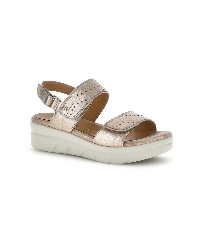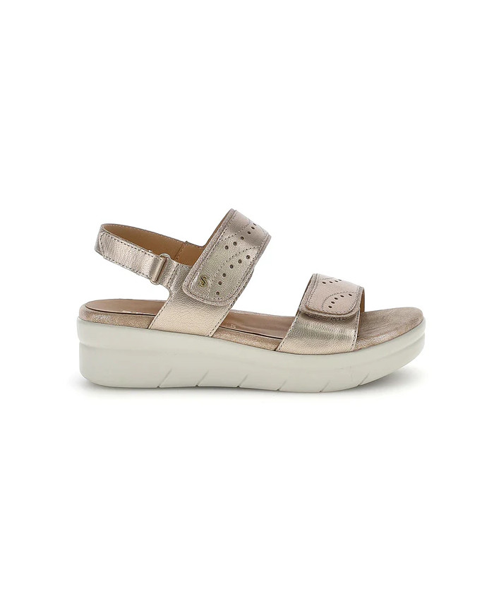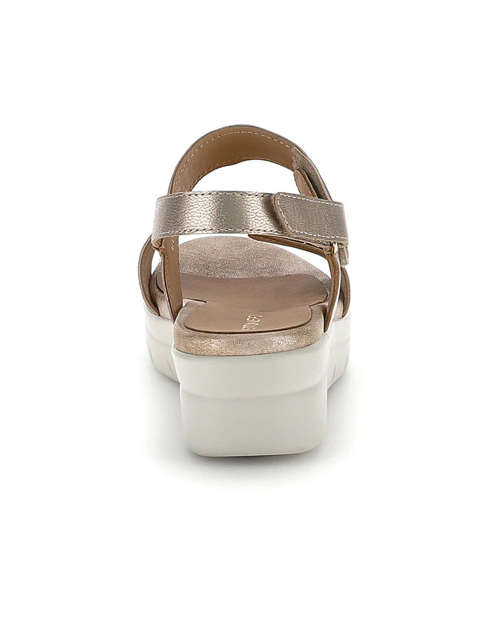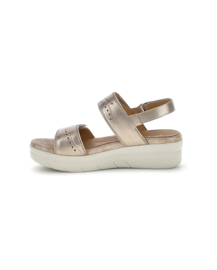 Sandalo con zeppa da donna in pelle laminata color oro con vestibilità regular. Questo modello dal design classico è dotato di doppio velcro regolabile, pensato per offrire una calzata personalizzata, assieme alla suola estremamente comoda. La tecnologia Blusoft® supporta la tua camminata garantendo massimo comfort e ammortizzazione. Suola in PU, altezza tacco (cm): 4.5