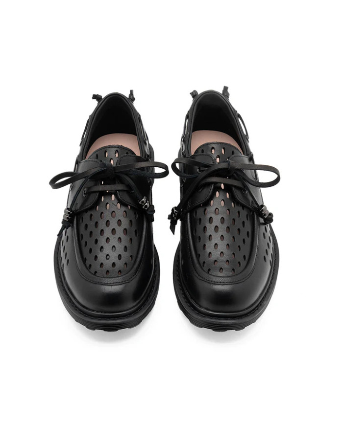 L’estetica boat-shoe incontra l’anima rebel: questa stringata in pelle si distingue per un audace design traforato all-over e lacci tecnici con terminali metal. Una silhouette indipendente che riscrive i codici del glam-rock con carattere e freschezza