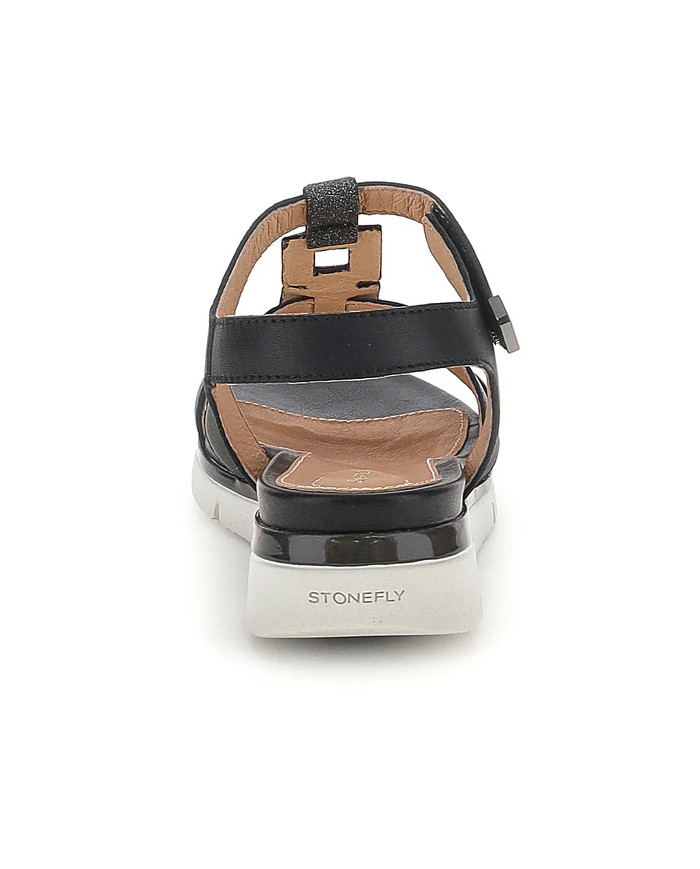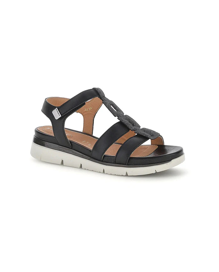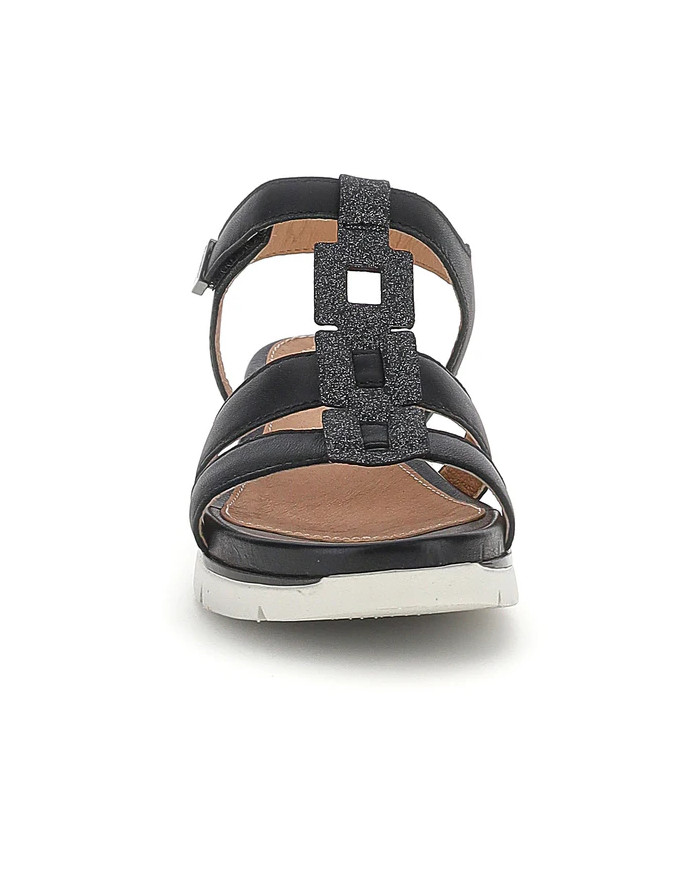 Sandalo senza tacco da donna in pelle nappa nera con vestibilità regular. Comodo, leggero e stiloso, con una calzata perfetta grazie alle chiusure regolabili con velcro, questo modello dal design essenziale, ma sempre alla moda, è un must-have per il tuo guardaroba. Perfetto per essere abbinato a qualsiasi outfit estivo, si distingue per il dettaglio glitter della tomaia. La tecnologia Blusoft® supporta la tua camminata garantendo massimo comfort e ammortizzazione. Suola in EVA, altezza tacco (cm): 3,3.