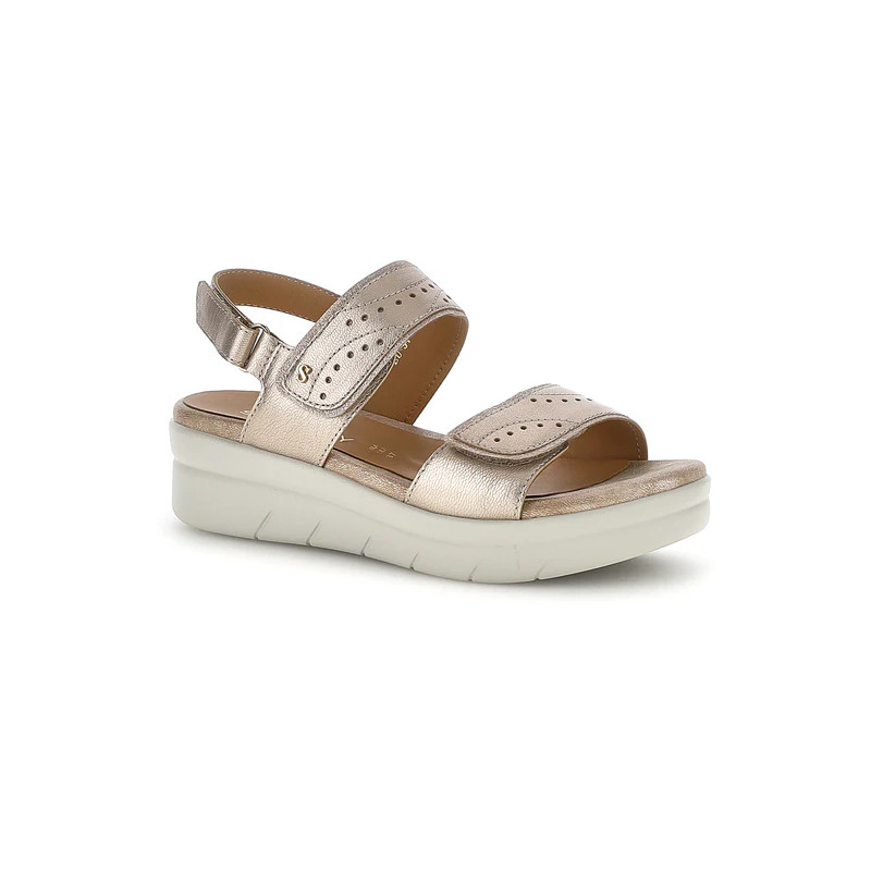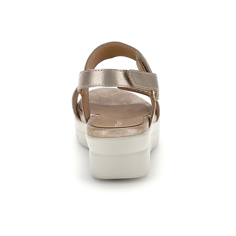 Sandalo con zeppa da donna in pelle laminata color oro con vestibilità regular. Questo modello dal design classico è dotato di doppio velcro regolabile, pensato per offrire una calzata personalizzata, assieme alla suola estremamente comoda. La tecnologia Blusoft® supporta la tua camminata garantendo massimo comfort e ammortizzazione. Suola in PU, altezza tacco (cm): 4.5