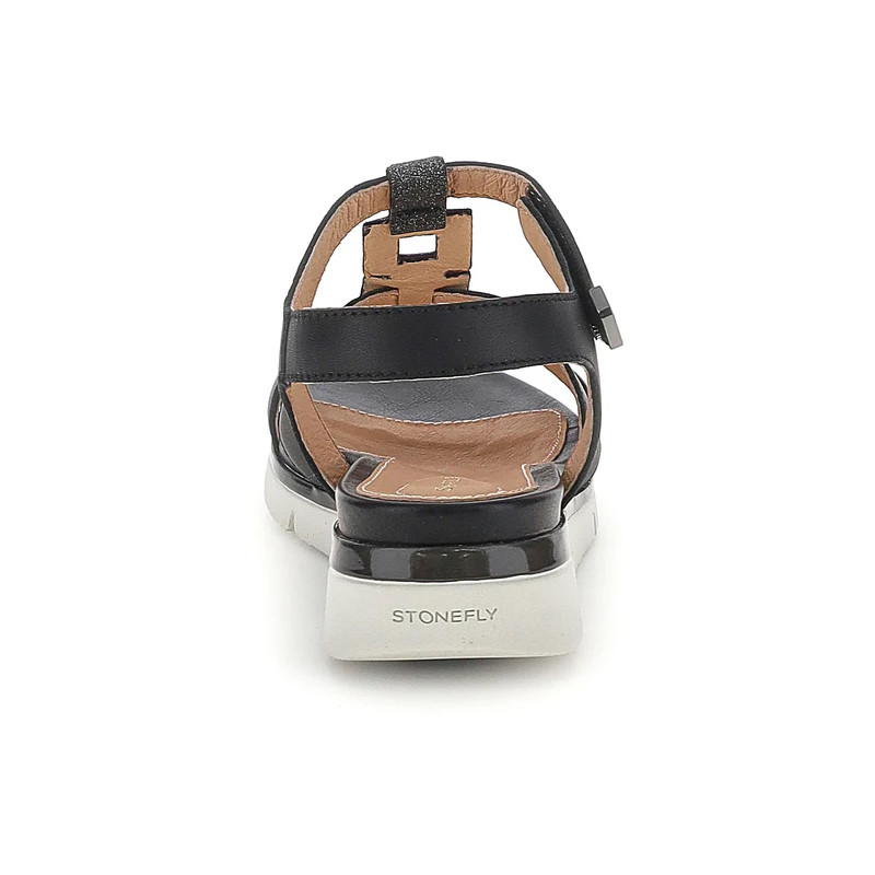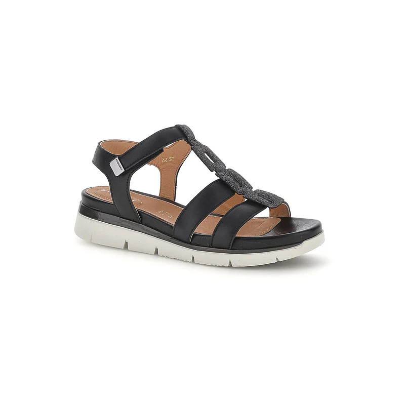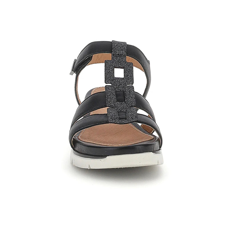 Sandalo senza tacco da donna in pelle nappa nera con vestibilità regular. Comodo, leggero e stiloso, con una calzata perfetta grazie alle chiusure regolabili con velcro, questo modello dal design essenziale, ma sempre alla moda, è un must-have per il tuo guardaroba. Perfetto per essere abbinato a qualsiasi outfit estivo, si distingue per il dettaglio glitter della tomaia. La tecnologia Blusoft® supporta la tua camminata garantendo massimo comfort e ammortizzazione. Suola in EVA, altezza tacco (cm): 3,3.