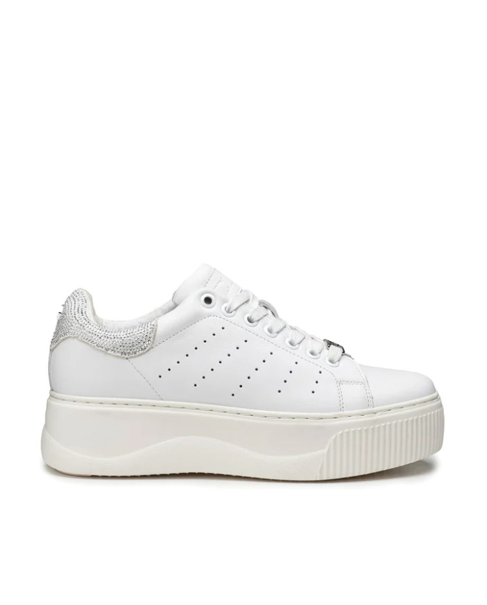 Total white per le sneakers in pelle firmate Cult per questa primavera estate. Lacci sur ton e il dettaglio glitterato argento sul retro della scarpa per un effetto davvero glamour. Da indossare sotto un vestito slim e blazer per un mix moderno e d'effetto. Altezza suola 5,3cm